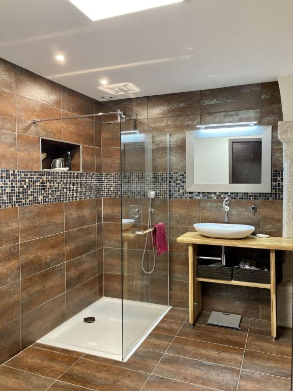 La maison de plain-pied offre de grands volumes et un confort optimal pour accueillir tous vos invités. Vous profiterez d’un vaste espace de vie de plus de 100 m², comprenant une cuisine conviviale, une grande table parfaite pour vos repas festifs et un coin salon chaleureux avec poêle à bois. L’agencement du gîte permet d’accueillir également les personnes à mobilité réduite grâce à une suite parentale adaptée avec dressing et salle de bain attenante.