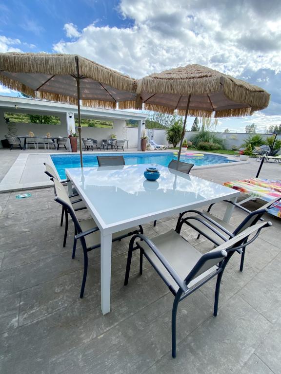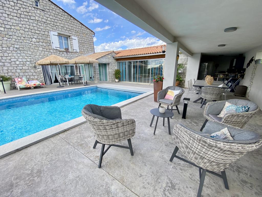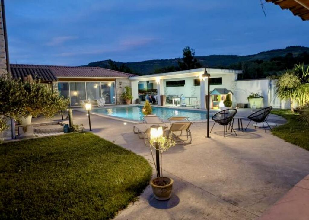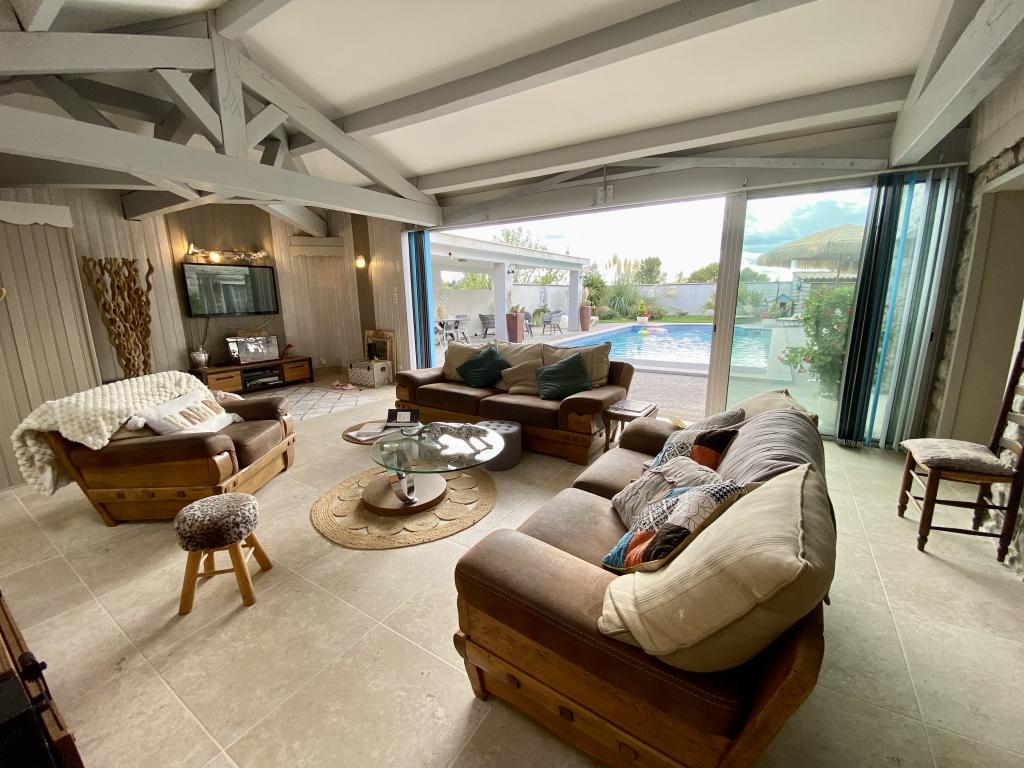 salon de jardin, table à manger et chaises, transats, cour, jardin, car park, parking, barbecue en dur, piscine privée, jeux d'enfants, pool house avec cuisine d'été et four à pizzas, terrain de pétanque...