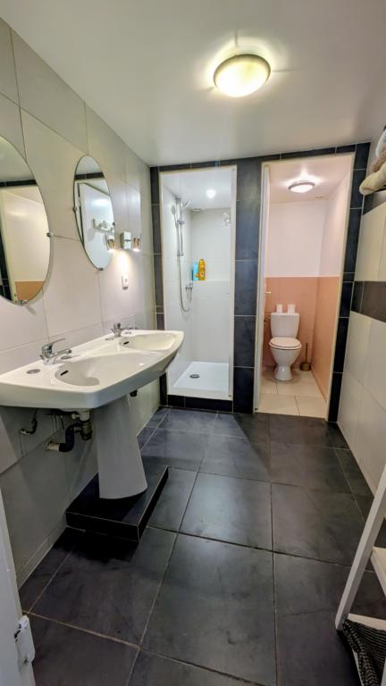 Pour le gîte principal de 15 couchages : Gîte spacieux (85 m2 au RDC) composé d’une grande pièce à vivre avec 2 grands canapés et des fauteuils, d’une spacieuse cuisine entièrement équipée, de 2 chambres doubles, d'une belle salle d’eau avec douche à l’italienne en rez-de-chaussée + 2 chambres à l étage avec 2 wc séparés + 2salles de bain avec baignoire et douche + 2 appartements au 2e étage comprenant 1 chambre, 1 salle de bains et 1 kitchenette dans chaque appartement.