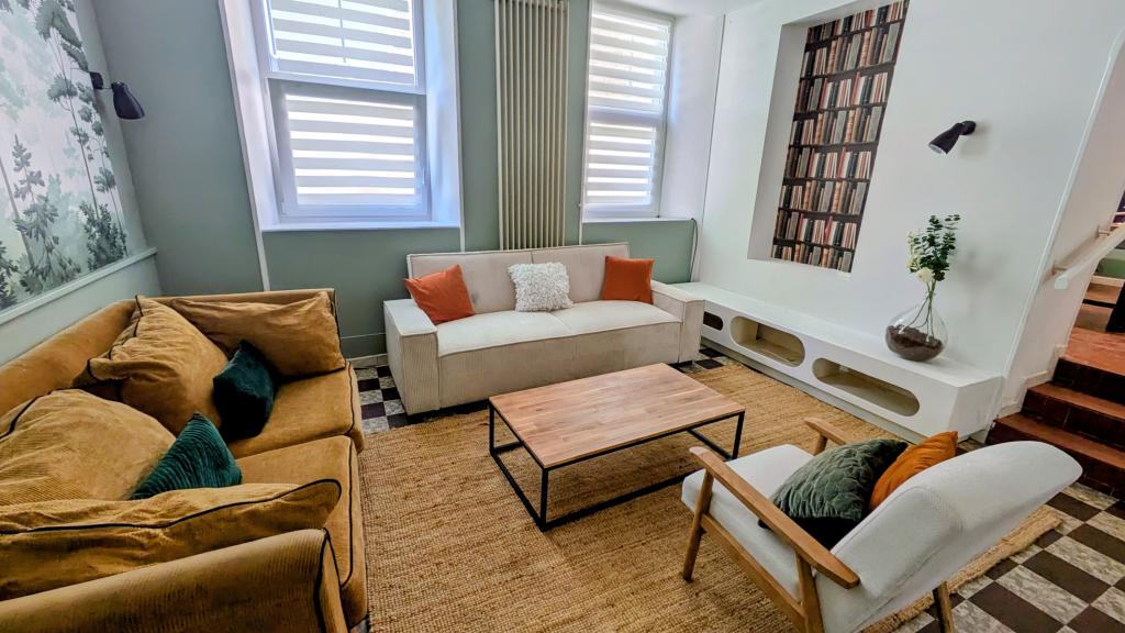 Salon convivial avec canapés, TV et jeux de société