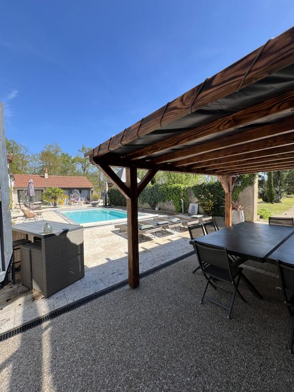 A l’extérieur du gîte, table de Ping Pong, bac à sable, balancoie barbecue, plusieurs terrasses et espèces couverts